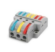 • Универсальные изолированные клеммы для ответвления любых типов медных проводников: моножильных и многожильных тонкопроволочных • Клеммы имеют монтажную площадку, позволяющую устанавливать клемму на плоскую поверхность или в монтажную коробку • Зажим проводов в клемме осуществляется при помощи рычагов • Наличие специального паза в корпусе клеммы для размещения рычага в закрытом положении надежно предотвращает случайное отсоединение проводника • Возможность измерения электрических параметров цепи без разбора и нарушения изоляции соединения • Безопасность и порядок в распределительной коробке • Максимальное напряжение: 450 В